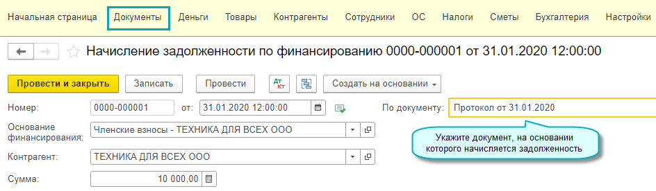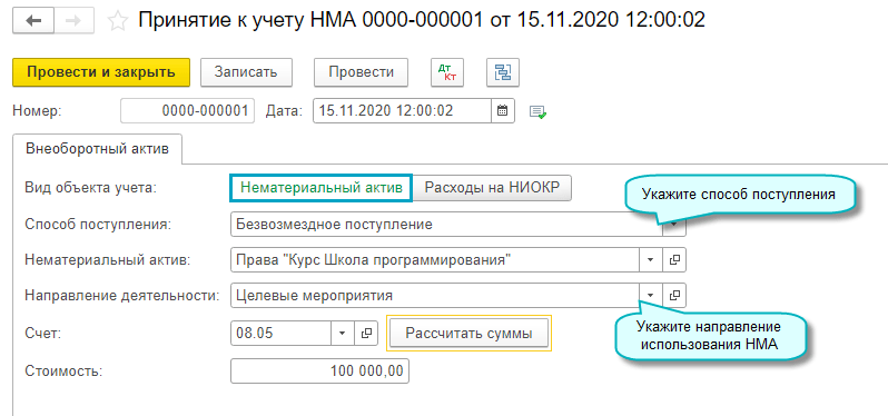 Полный интерфейс: меню "ОС и НМА - Нематериальные активы - Поступление НМА".