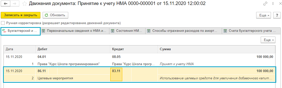 Добавлена возможность начисления амортизации основных средств, используемых в некоммерческой деятельности (п.4 ФСБУ 6/2020 "Основные средства"). Сумма амортизации уменьшает остаток по счету 83 "Добавочный капитал".