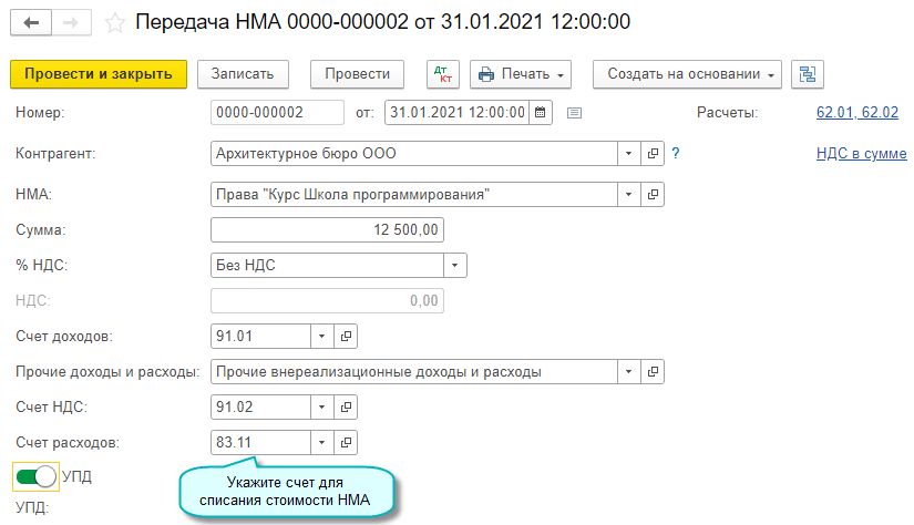 Полный интерфейс: меню "ОС и НМА - Нематериальные активы - Передача НМА".