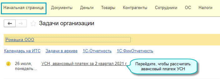 Простой интерфейс: меню "Начальная страница - Задачи организации".