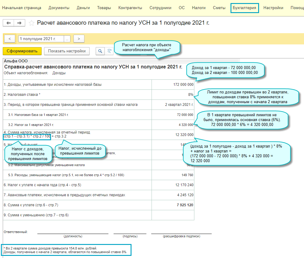В 2021 году с квартала, в котором доходы превысили 154,8 млн. руб. (но не более 200 млн. руб.) и (или) средняя численность работников превысила 100 человек (но не более 130 человек), применяется налоговая ставка УСН: