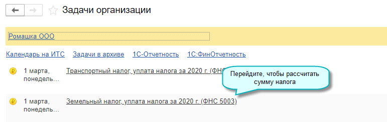 Расчет суммы налога по итогам года выполняется при проведении регламентных операций по закрытию месяца. Также налог можно рассчитать в задаче по сроку уплаты налога.