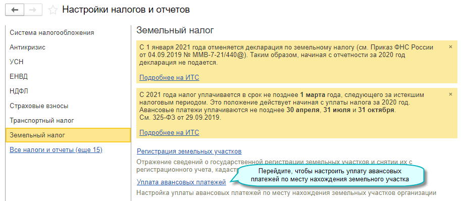 Полный интерфейс: меню "Главное - Настройки - Налоги и отчеты - Настройки налогов и отчетов - Земельный налог".
