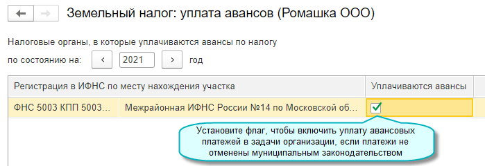 Изменен порядок определения срока уплаты земельного налога в задачах организации. Сроки уплаты налога и авансовых платежей для организаций с 2021 года устанавливаются Налоговым кодексом РФ, а не законодательными актами по месту нахождения земельных участков. При этом авансовые платежи уплачиваются, если они не отменены муниципальными законодательными актами, законами городов Москвы, Санкт-Петербурга, Севастополя (Федеральный закон от 29.09.2019 № 325-ФЗ).
