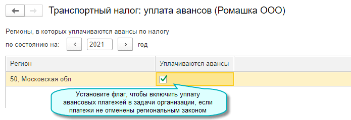 Изменен порядок определения срока уплаты транспортного налога в задачах организации. Сроки уплаты налога и авансовых платежей для организаций с 2021 года устанавливаются Налоговым кодексом РФ, а не региональными законами. При этом авансовые платежи уплачиваются, если они не отменены региональным законом (Федеральный закон от 29.09.2019 № 325-ФЗ).