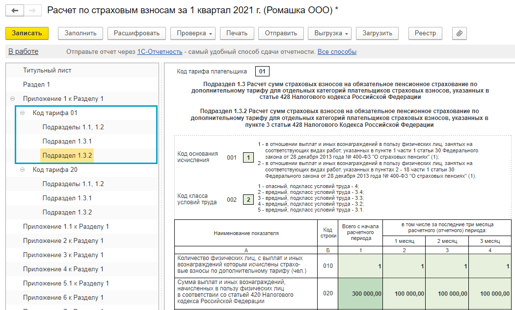 В расчете по страховым взносам данные по дополнительному тарифу за вредные условия труда при применении пониженного тарифа страховых взносов для субъектов малого и среднего предпринимательства полностью включаются в раздел по основному тарифу (код 01). Такой способ заполнения применяется начиная с отчета за 1 квартал 2021 года.
