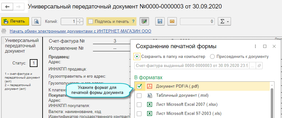Добавлена возможность сохранения печатных форм документов в формате PDF/A, который используется для долгосрочного хранения электронных документов. Формат доступен при работе на платформе 8.3.16.