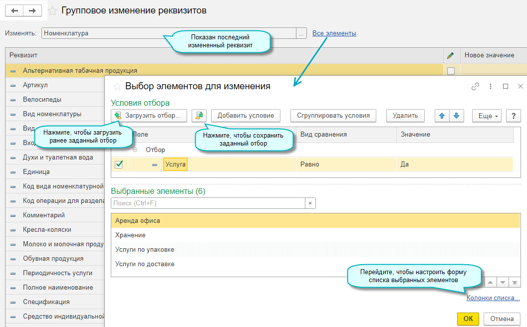 В групповом изменении реквизитов добавлена возможность сохранения и восстановления заданных отборов, изменения списка выбранных элементов.