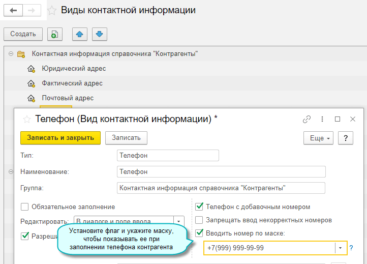 В контактной информации справочников добавлена возможность автоматического обновления устаревших адресов по классификатору ФИАС и использования маски для номера телефона.