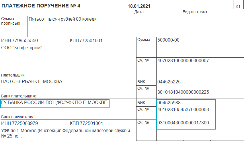 Добавлена возможность заполнения реквизитов банка Федерального казначейства по классификатору БИК. С 2021 года денежные средства налоговым, таможенным и другим государственным органам перечисляются на казначейские счета Федерального казначейства (Федеральный закон от 27.12.2019 № 479-ФЗ). Банковские реквизиты для перечисления налогов, страховых взносов и других платежей налоговым органам приведены в Письме ФНС России от 08.10.2020 № КЧ-4-8/16504@. До 30.04.2021 платить налоговым органам можно также по реквизитам, действовавшим в 2020 году.