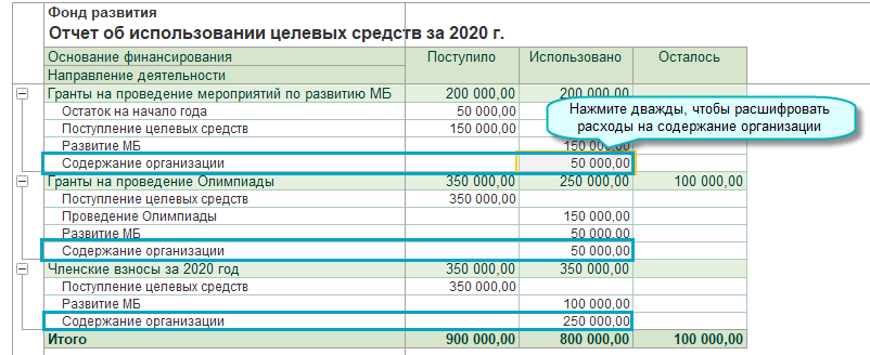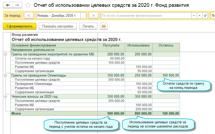 Добавлен отчет об использовании целевых средств, который позволяет проанализировать поступление и использование средств по основаниям финансирования и направлениям деятельности.