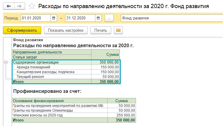Полный интерфейс: меню "Деятельность - Отчеты - Расходы по направлениям деятельности".