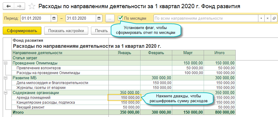 Добавлен отчет, который позволяет проанализировать расходы по всем направлениям деятельности в динамике по месяцам.