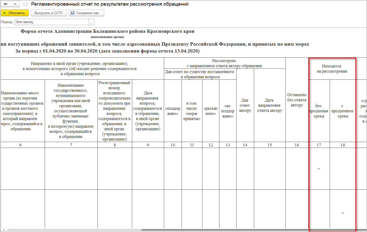 - В регламентированном отчете колонка Находится на рассмотрении теперь разделена на две: С продлением срока и Без продления срока.