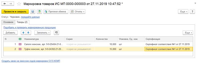 По указанным данным определяется потребность в кодах маркировки: если остатков в пуле для маркировки недостаточно, то на недостающее количество необходимо сформировать заказ на эмиссию. Ссылка на формирование документа Заказ на эмиссию кодов маркировки СУЗ появится в нижней части документа Маркировка товаров.