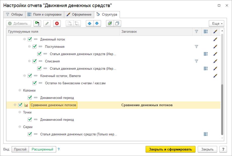 Для сравнительного анализа денежных потоков предусмотрен опциональный раздел отчета Сравнение денежных потоков: