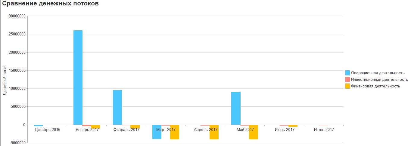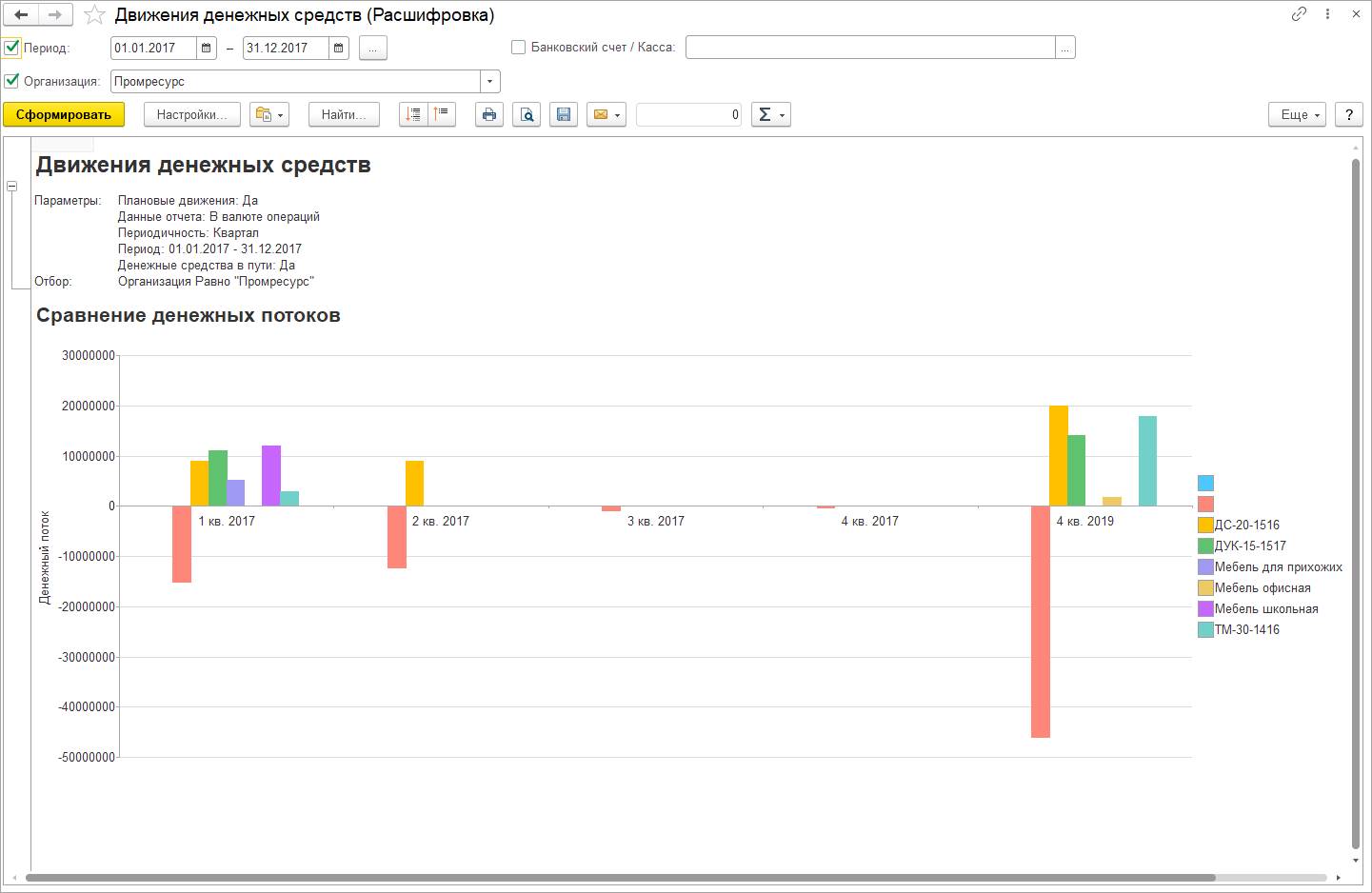 В данном варианте отчета можно наложить отбор в шапке отчета на направление деятельности, в рамках которого требуется оценить денежные потоки. В результате будет получен график и табличный отчет по движениям ДС: