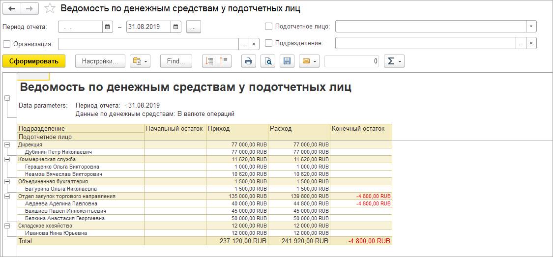 Отчет предназначен для анализа расчетов с подотчетными лицами, отражает информацию по наличию авансов у подотчетных лиц или задолженности организации перед подотчетными лицами на начало и конец отчетного периода, а также содержит информацию по выданным авансам и их использованию подотчетными лицами.