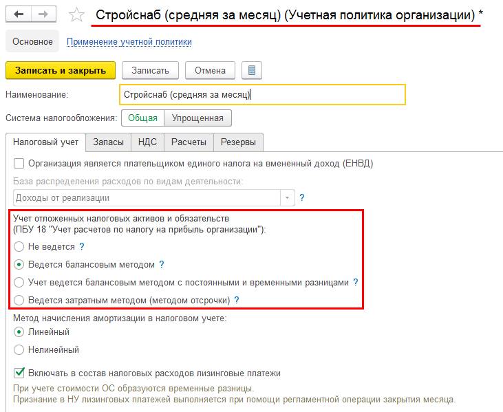 В карточку учетной политики организации добавлена настройка для выбора варианта применения ПБУ 18 для расчета налога на прибыль Учет отложенных налоговых активов и обязательств (ПБУ 18 «Учет расчетов по налогу на прибыль организации»).