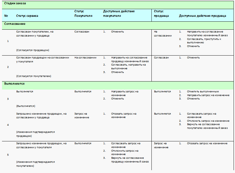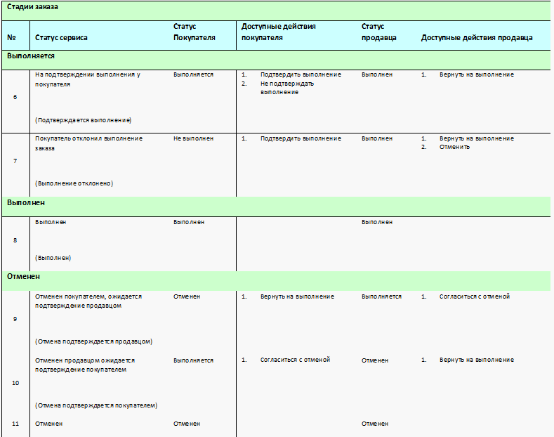 Статусы сервиса, состояния заказов, доступные действия покупателя и продавца представлены на схеме.
