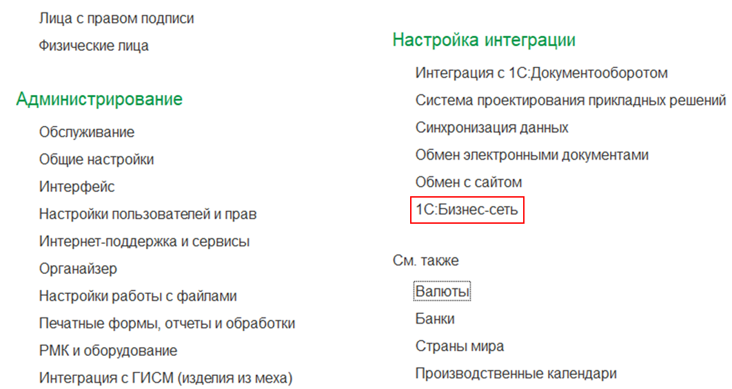 Настройки сервиса «1С:Бизнес-сеть» перенесены из панели навигации НСИ и администрирование – Настройка НСИ и разделов - Обмен электронными документами в НСИ и администрирование – Настройка интеграции.