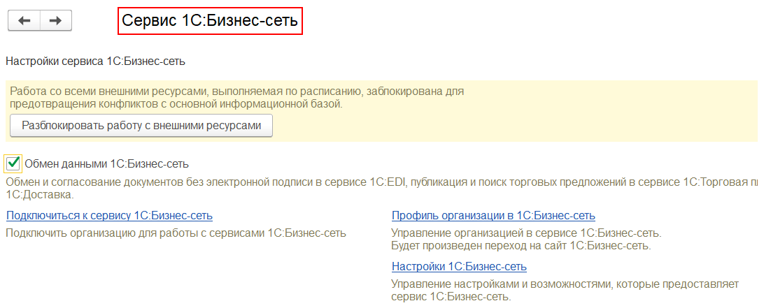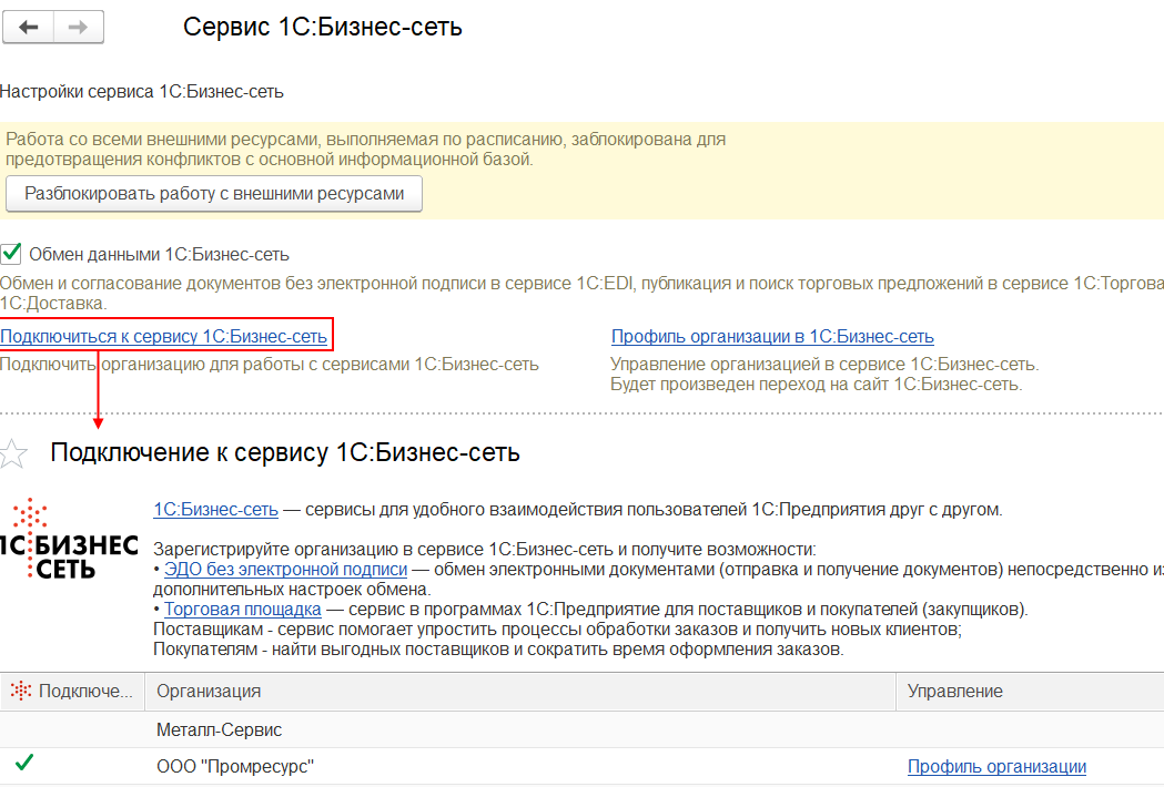 Для работы с сервисом «1С:EDI» организации необходимо зарегистрироваться в сервисе 1С:Бизнес-сеть (команда Подключиться к сервису 1С:Бизнес-сеть)(НСИ и администрирование – Настройка интеграции - 1С:Бизнес-сеть). Отдельной регистрации не требуется.