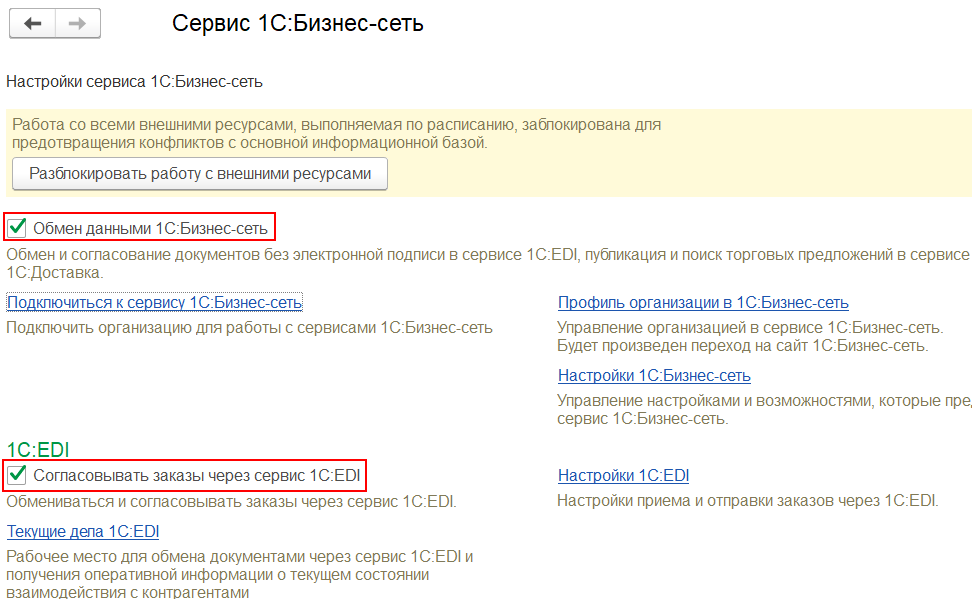 Для обмена и согласования заказов без электронной подписи в сервисе «1С:EDI» необходимо включить функциональные опции: