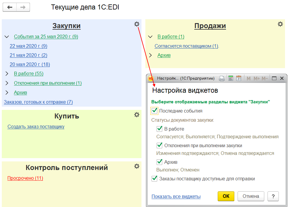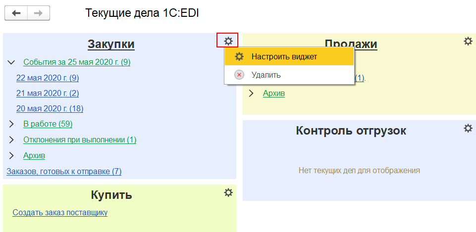 Для ведения повседневной работы, получения быстрого и удобного доступа к документам, справочникам и настройкам, для обмена документами через сервис 1С:EDI и получения оперативной информации о текущем состоянии взаимодействия с контрагентами по EDI, предусмотрено рабочее место Текущие дела 1С:EDI.