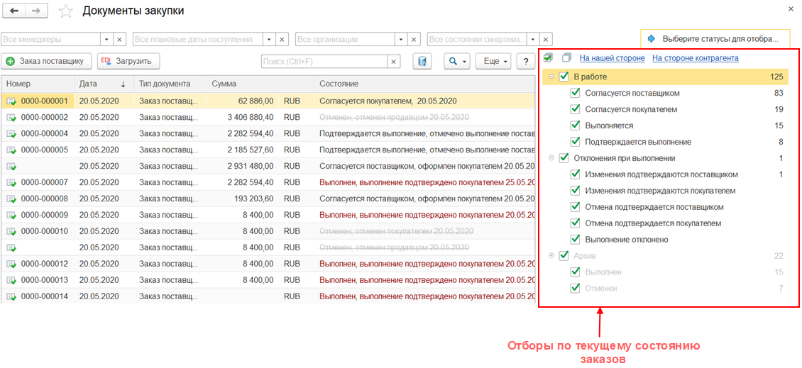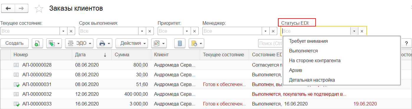 На форму списка документов заказов поставщикам и заказов клиентов добавлен отбор заказов по статусу EDI и колонка Состояние EDI для контроля текущего состояния EDI заказов при работе с сервисом EDI.