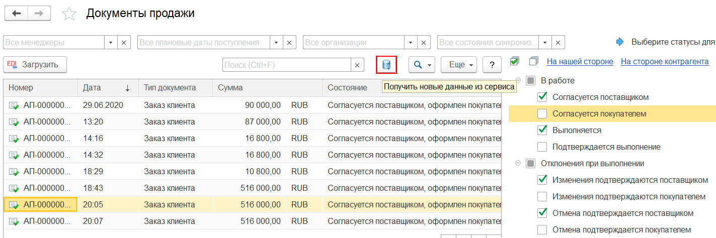 Для контроля текущего состояния заказов при работе с сервисом EDI предусмотрен реквизит Состояние EDI на форме списка документов Заказ поставщику, Заказ клиента.