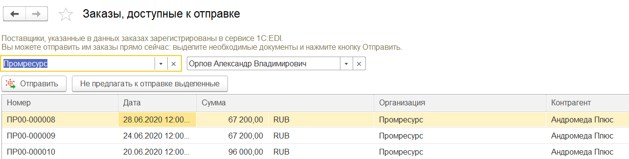 Система автоматически отслеживает, какие заказы готовы к отправке контрагентам с использованием сервиса 1С:EDI. Такие заказы показываются в рабочем месте Заказы, доступные к отправке.