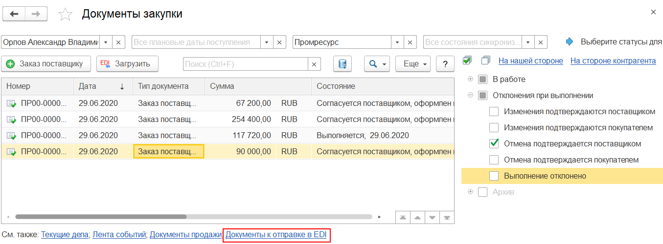 Сформированный заказ отображается в документах закупки сервиса 1С:EDI (на стороне покупателя).