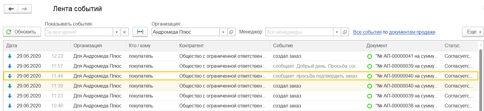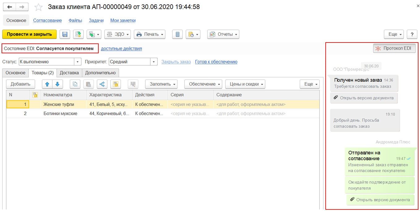 В протоколе также можно видеть информацию о том, что заказ отправлен на согласование покупателем.