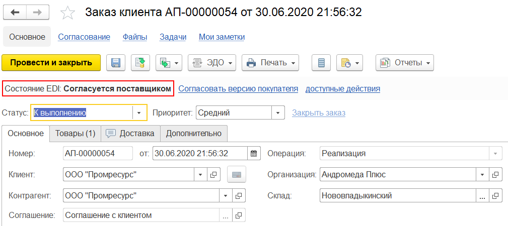 По результату отправки заказу поставщику присваивается состояние EDI Согласуется поставщиком и отображаются доступные действия, которые может выполнить пользователь в отношении заказа. В зависимости от текущего состояния доступны разные действия.
