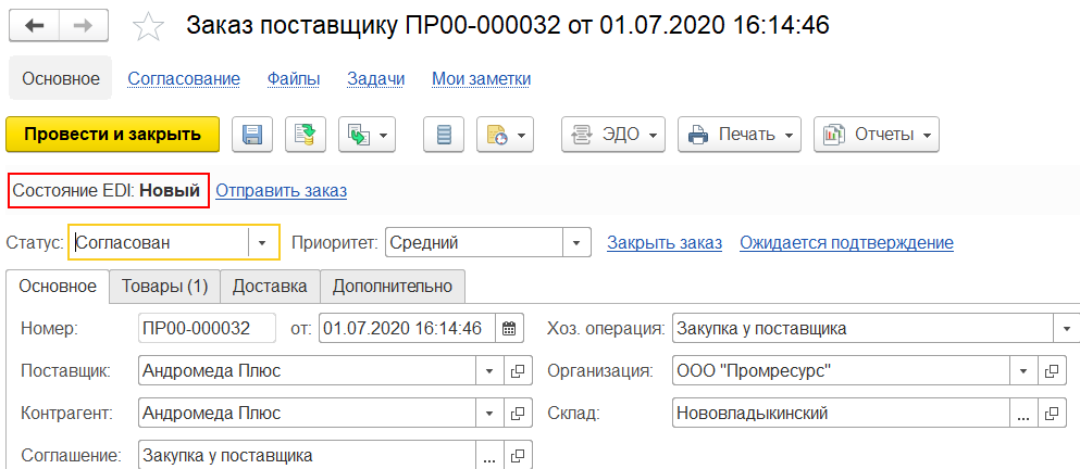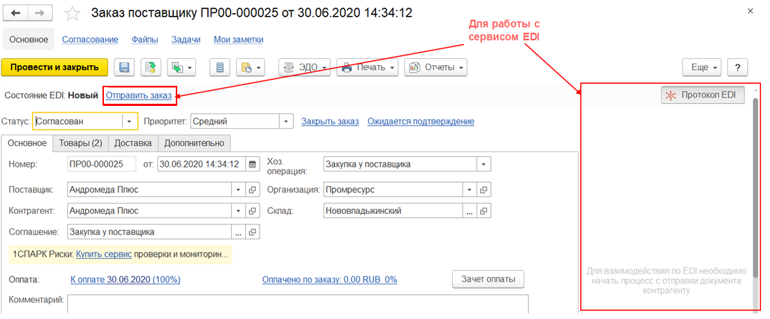 Для взаимодействия по EDI необходимо начать процесс отправки заказа контрагенту.