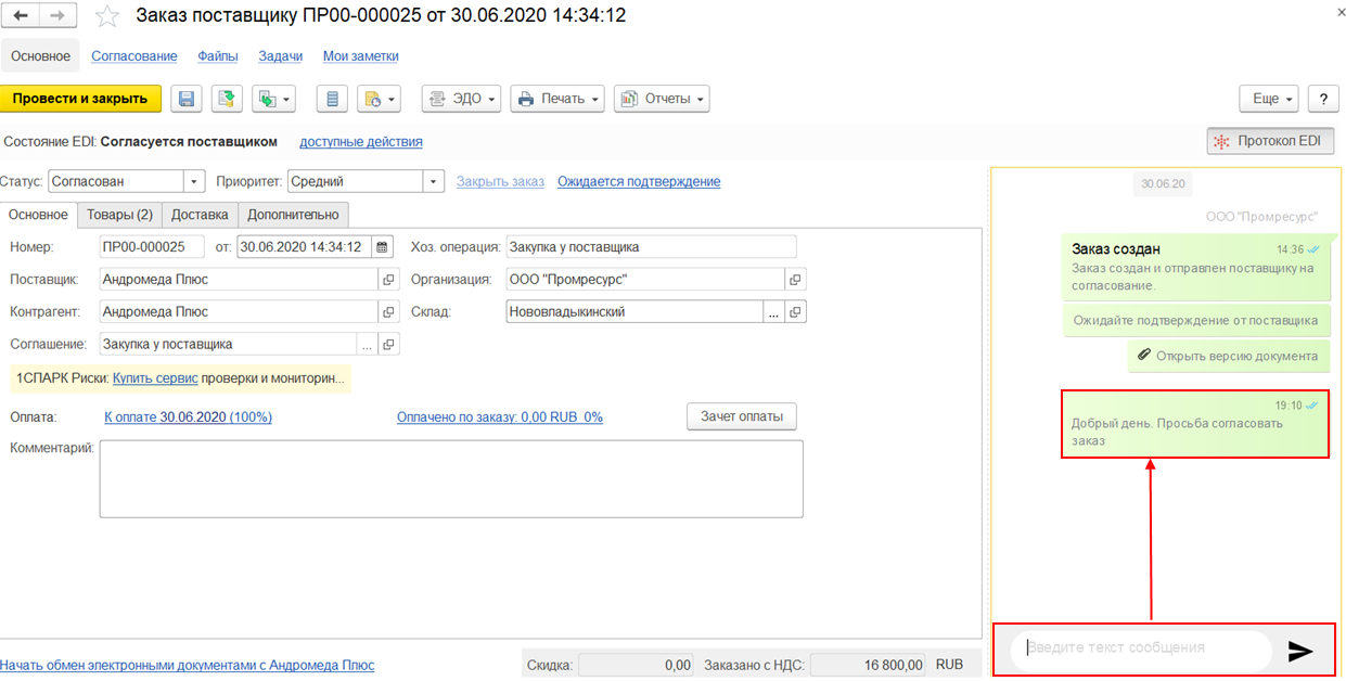 Протокол EDI отображает историю работы с документом в сервисе EDI и позволяет писать сообщения контрагенту, тем самым обеспечивая возможность обсуждения деталей по заказу.