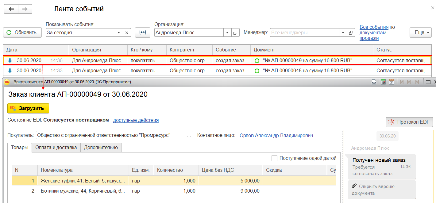 Все события (новые документы, изменение статусов, новые сообщения в протоколе EDI) показываются в ленте новостей. Лента событий позволяет быть в курсе, какие события произошли в отношении заказов в сервисе 1C:EDI (например, создан, согласован, выполнен заказ) и в каком статусе заказ.
