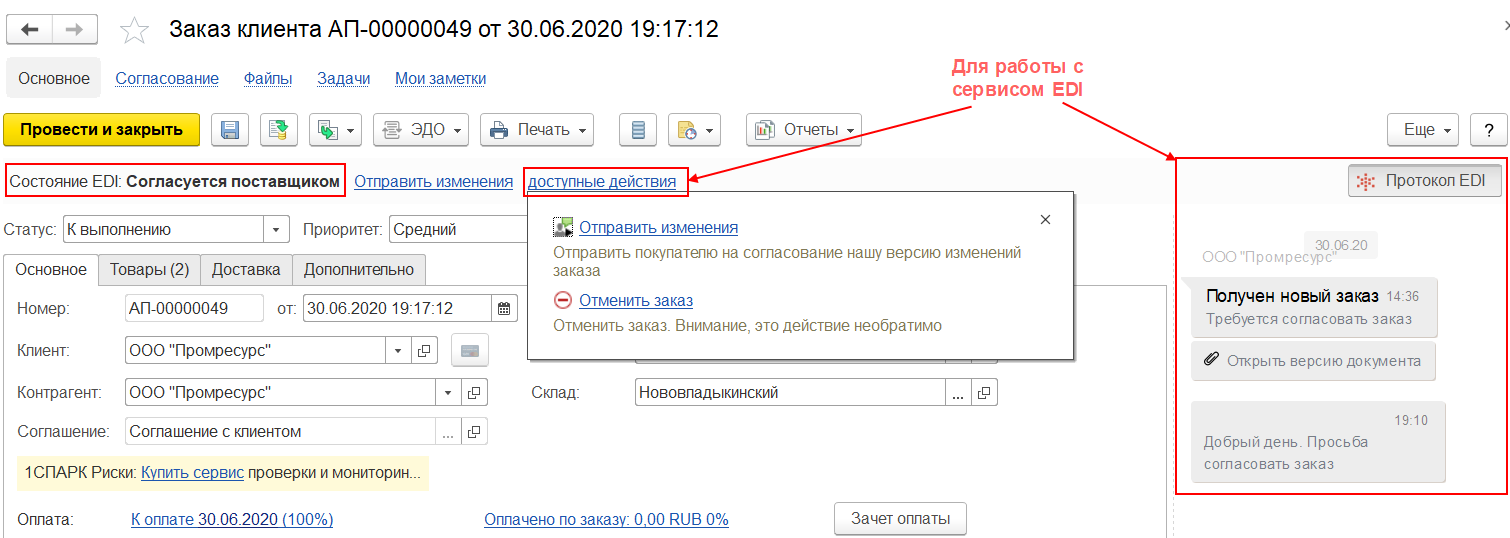 В протоколе EDI заказа клиента показывается история взаимодействия с поставщиком, при необходимости поставщик может добавить комментарий к заказу.