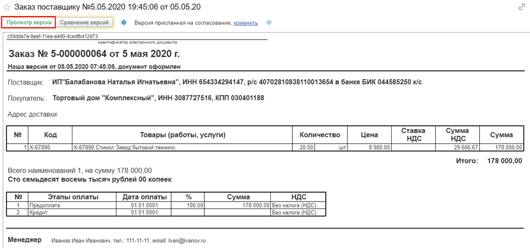 Просмотр версии заказа присланной контрагентом на согласование: