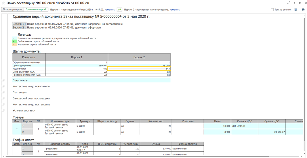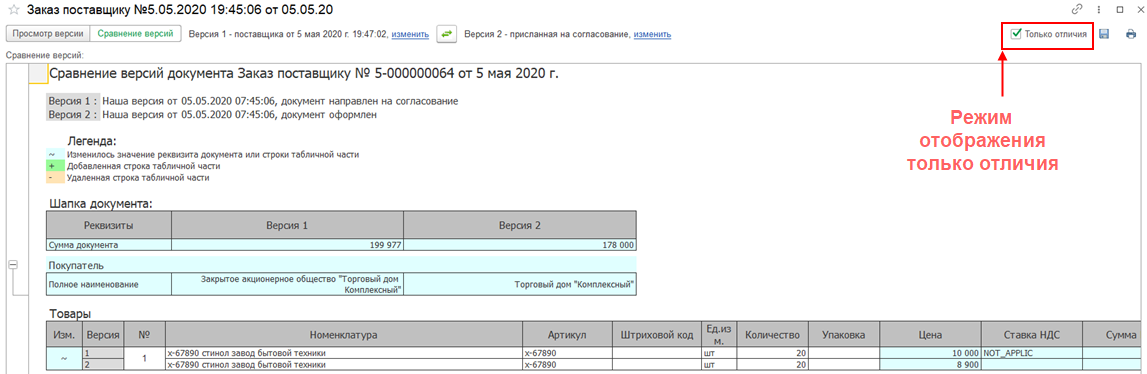 Просмотреть отличия между версиями покупателя и продавца можно в режиме Сравнение версий.
