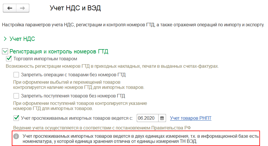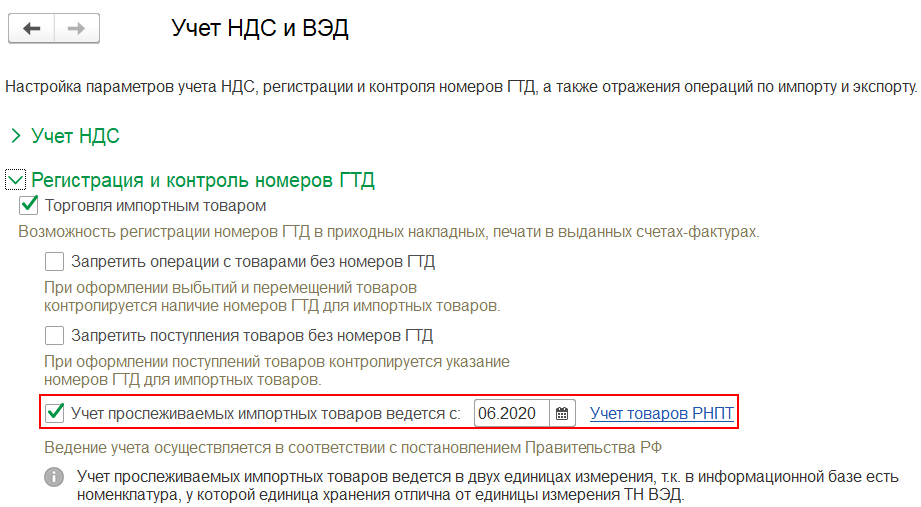 Для учета прослеживаемых импортных товаров предусмотрено рабочее место Учет товаров РНПТ, доступное по ссылке НСИ и администрирование – Настройка НСИ и разделов – Учет НДС и ВЭД.