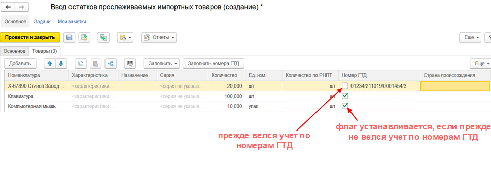 Если прежде не велся учет по номерам ГТД, то в документе ввода остатков прослеживаемых импортных товаров устанавливается флаг