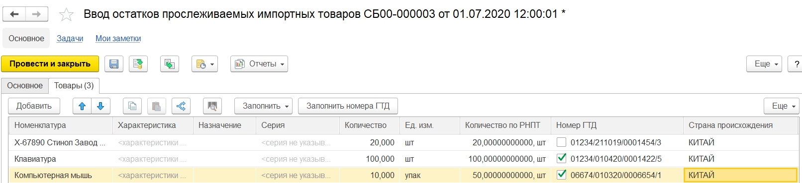 Если по товару прежде не велся учет номеров ГТД и на остатках нет товаров с ГТД, то для начала учета прослеживаемых товаров необходимо списать остатки с пустыми номерами ГТД и оприходовать остатки с новыми номерами ГТД (РНПТ).