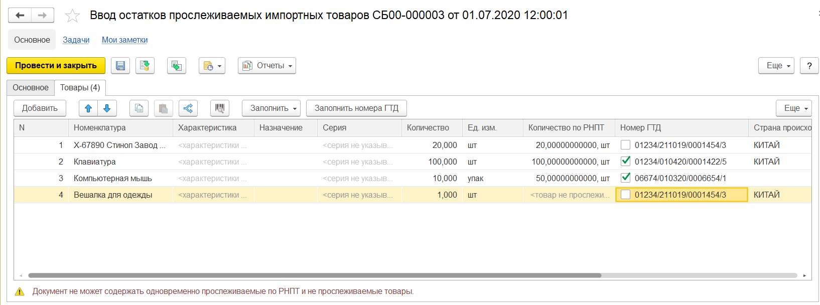 Документ ввода остатков не может содержать одновременно прослеживаемые по РНПТ и не прослеживаемые товары.