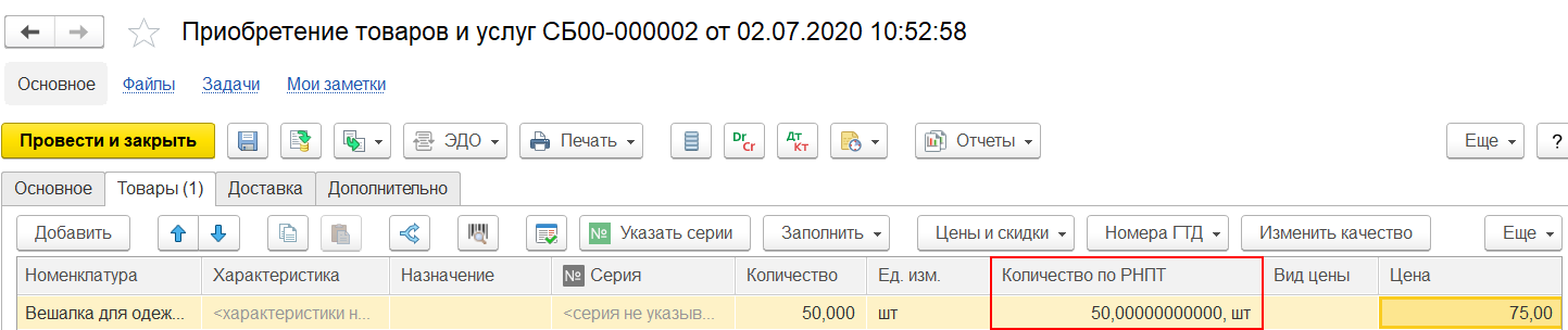 При учете прослеживаемых импортных товаров в двух единицах измерения в документах доступно поле Количество по РНПТ, количество в котором заполняется в единице измерения прослеживаемости ТН ВЭД.