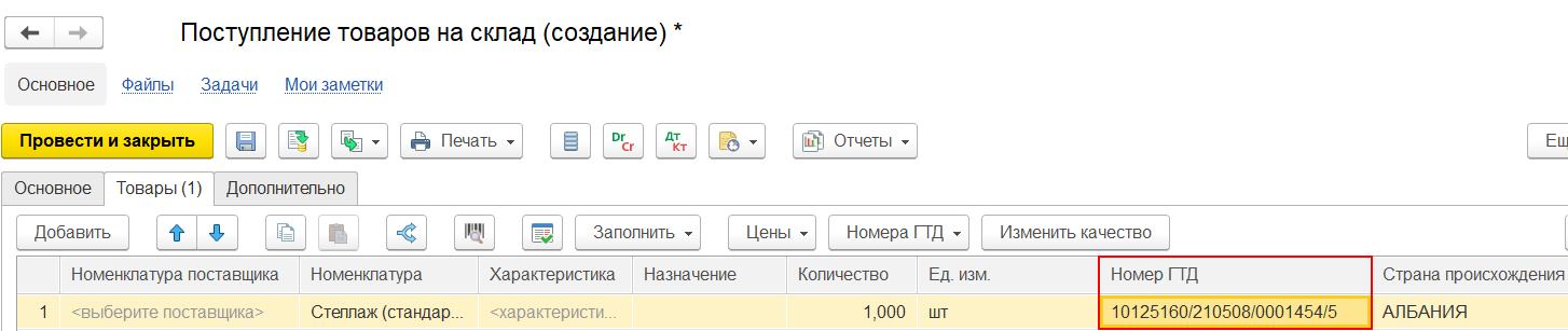 Для учета по номерам ГТД в карточке номенклатуры устанавливается флаг Учет по номерам ГТД.
