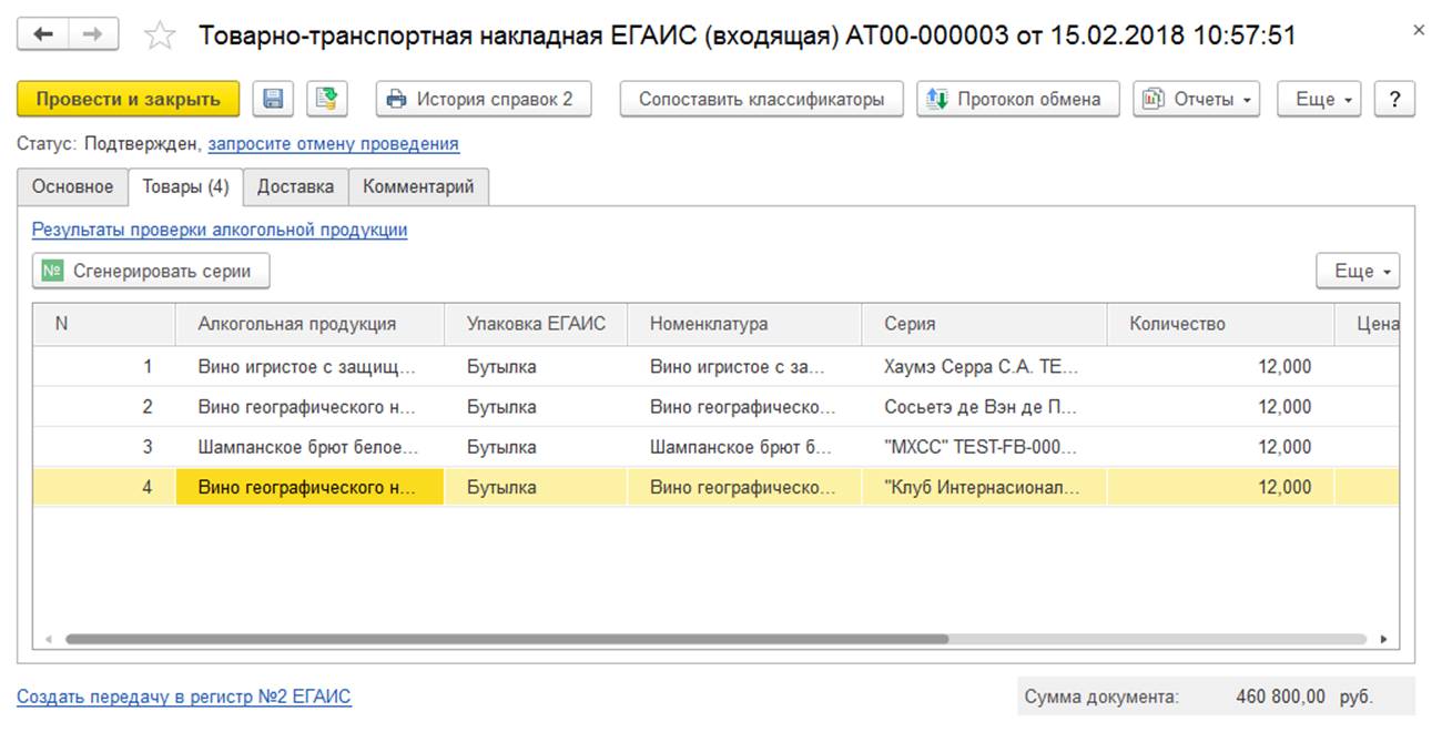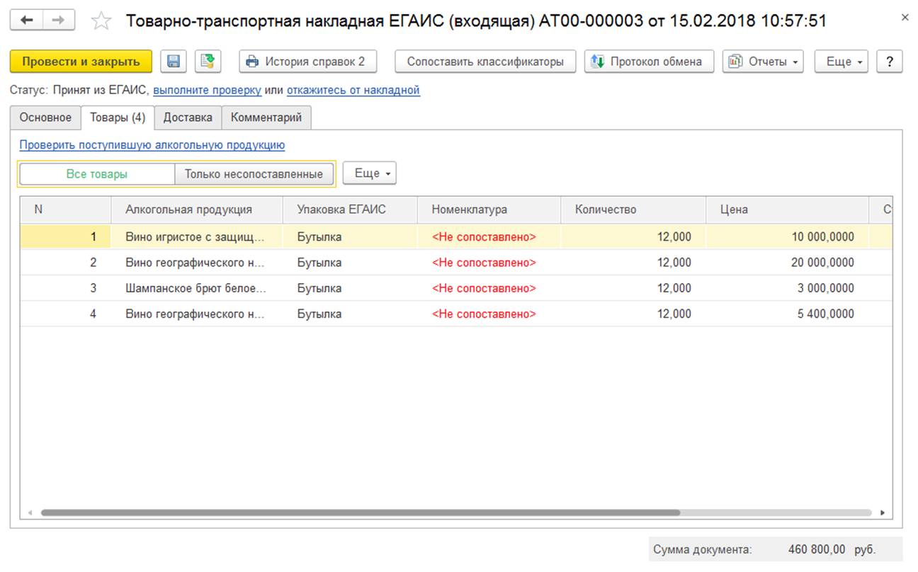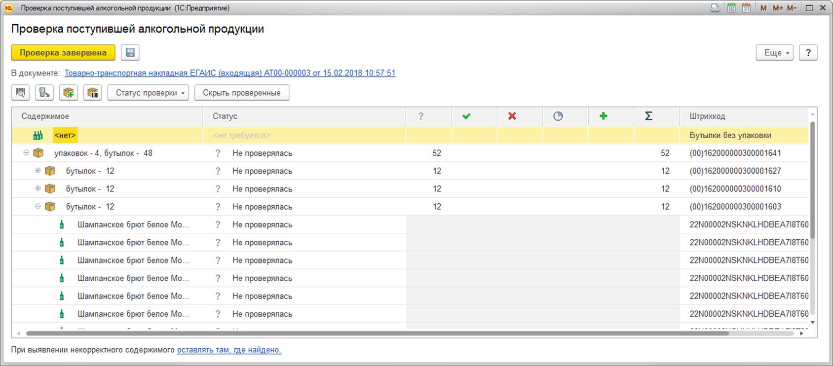 При поступлении алкогольной продукции в маркированной упаковке от поставщика, сведения об упаковке будут указаны в документе ТТН ЕГАИС (входящая). Состав и штрихкоды упаковок можно посмотреть в форме Проверка поступившей алкогольной продукции.