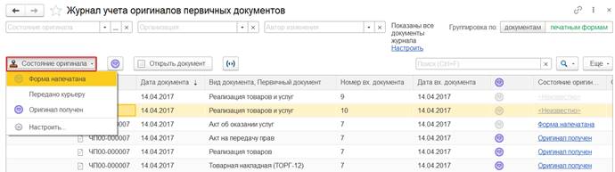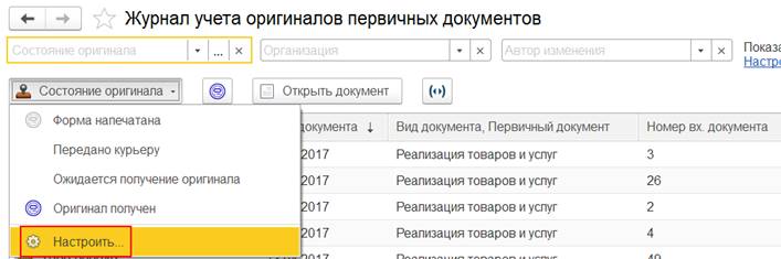 Также перейти к настройке состояний оригиналов можно из журнала учета оригиналов первичных документов (команда Настроить).
