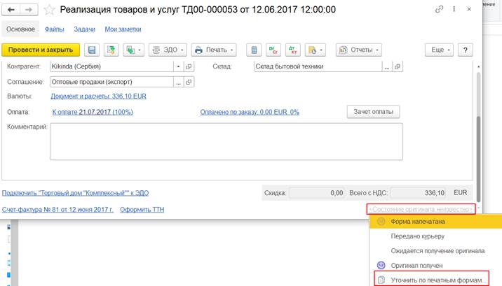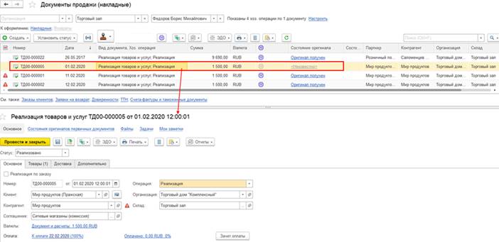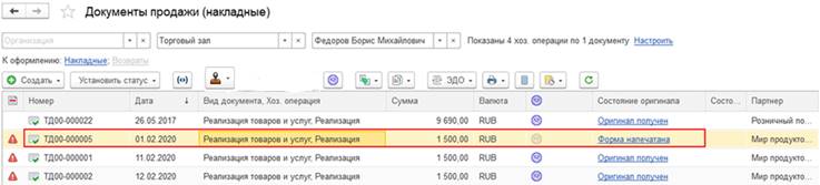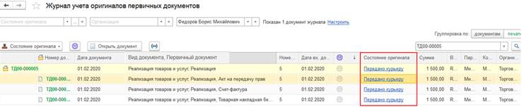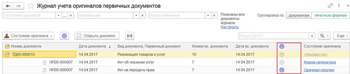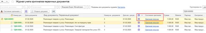 Также состояние оригинала первичного документа отображается непосредственно на форме документа реализации товаров и услуг.