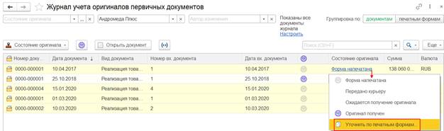 Предопределенные состояния оригиналов первичных документов хранятся в справочнике НСИ и администрирование – Администрирование – Печатные формы, отчеты и обработки – Состояния оригиналов первичных документов.
